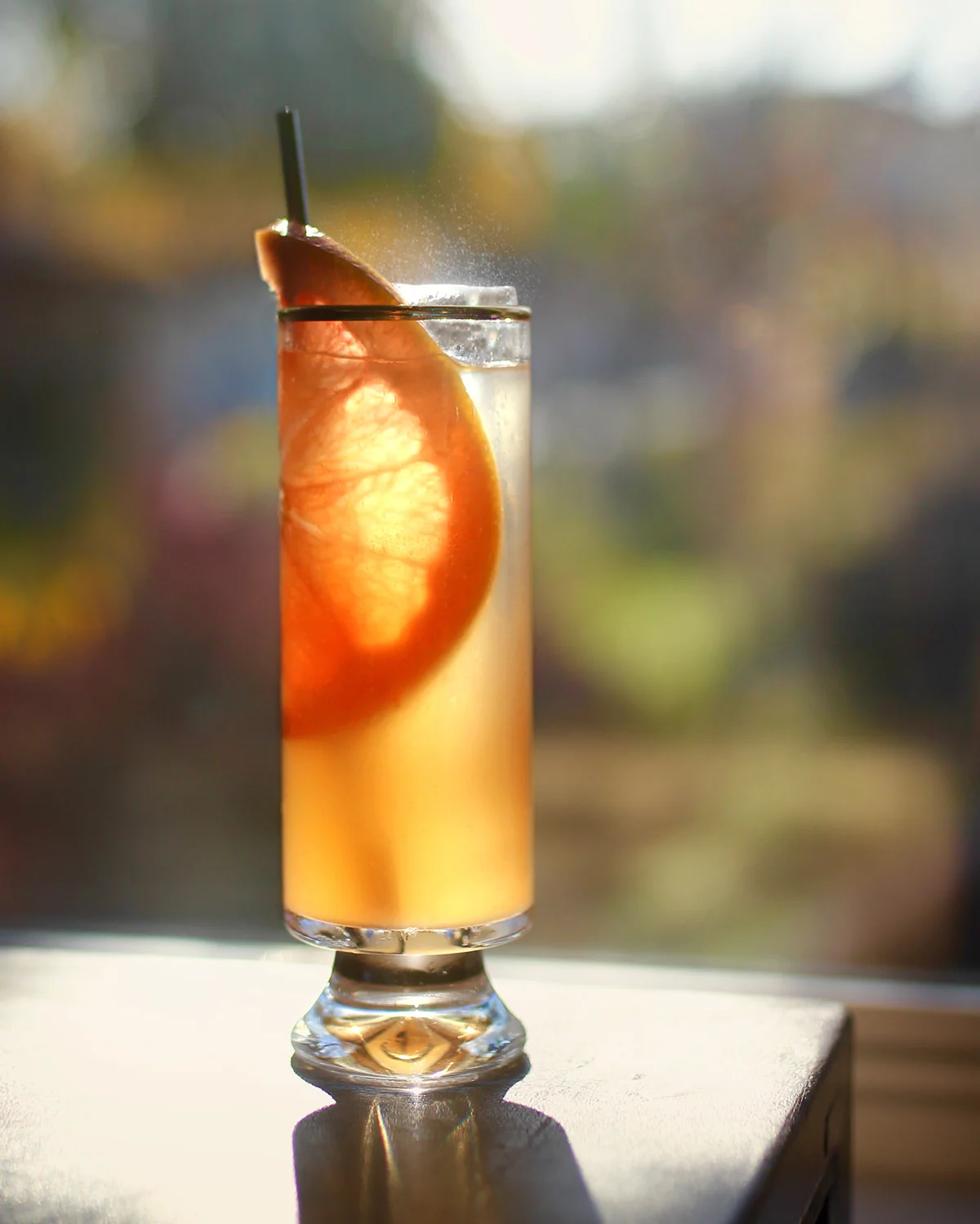 Add all ingredients except club soda to a shaking tin and then add ice. Shake well, strain over ice into a Collins glass and top with club soda. Garnish with a slice of grapefruit and add a straw.